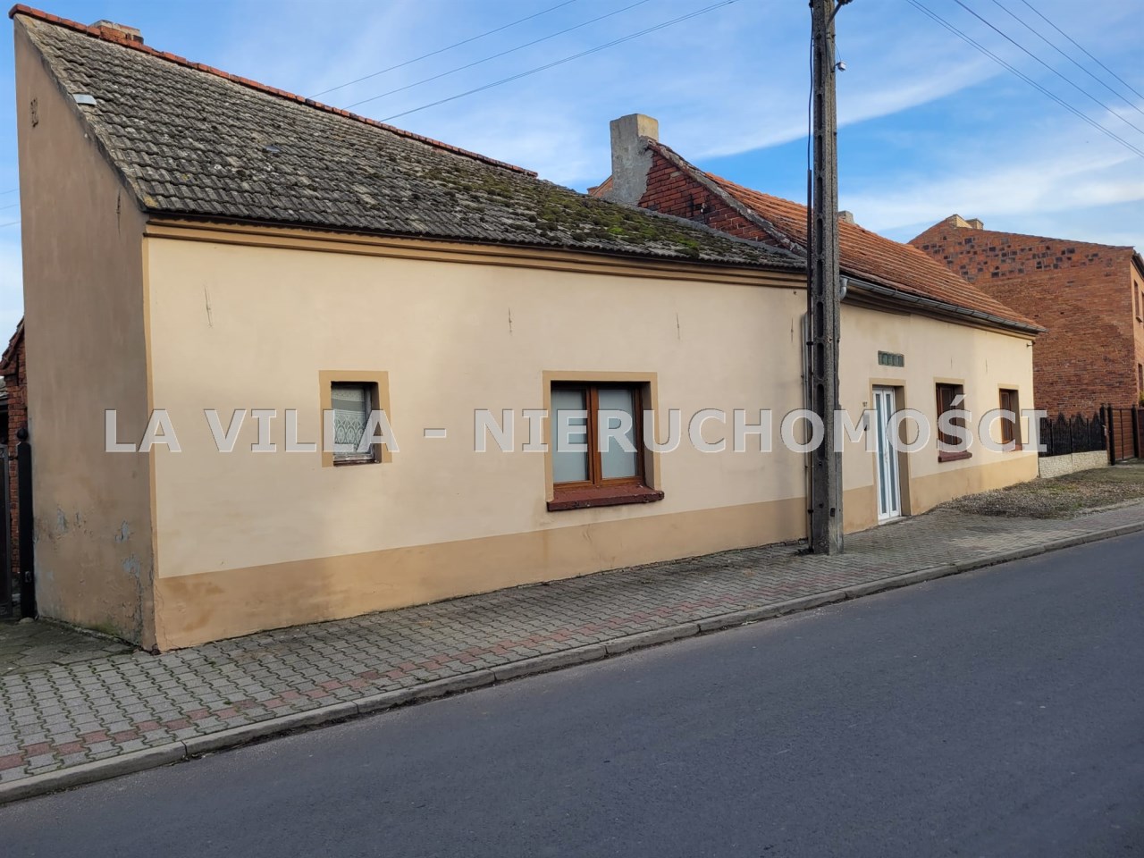 Budynek mieszkalny o powierzchni ok. 80 m2, to klasyczna zabudowa wiejska - wąski, wydłużony dom ze spadzistym dachem, usytuowany przy linii zabudowy od strony ulicy.